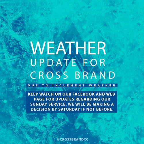 Due to the inclement weather forecasted for this weekend, we are closely monitoring conditions and will be making a decision regarding Sunday’s service. We will announce our decision by Saturday, if not sooner. If we do need to cancel for Sunday we will air an online service at 10am on Facebook and YouTube.
